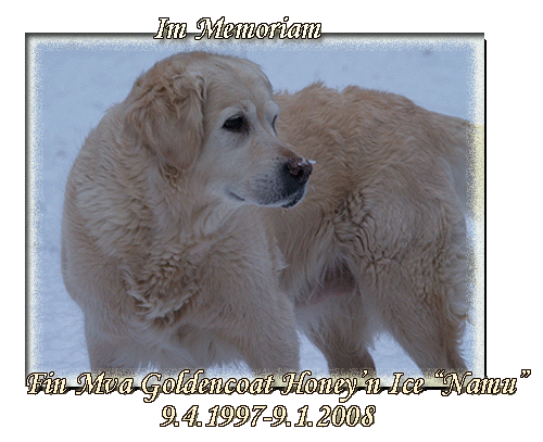 Rakas, kultainen Namumme, ihana seuralainen ja perhekoira sekä erinomainen metsästyskaveri on siirtynyt rajan taa. Taas valo viiltää taivaanrantaa Se päivän yöstä erottaa On tullut aika pois se antaa Jota niin paljon rakastaa